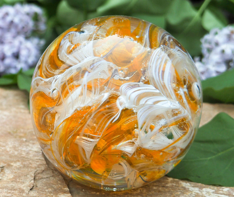 This beautiful orb is infused with a small amount of cremains from your loved one. With a colorful cotton candy pattern swirled throughout, this piece is a lovely way to keep those summer carnival memories with loved ones close to heart and mind. This orb has a flat spot on the bottom so you may display without fear of it rolling away.